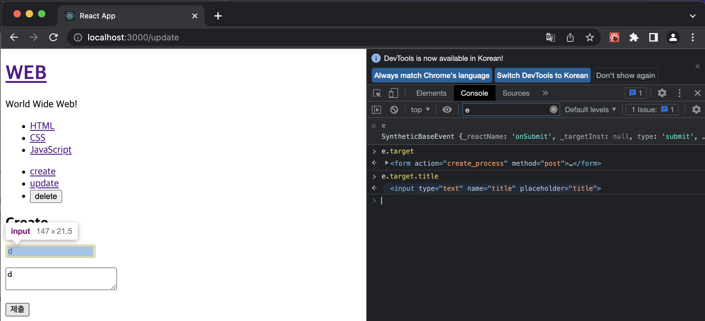 e.target은 form 자체이고 input 값은 e.target.title.value임을 확인할 수 있다.