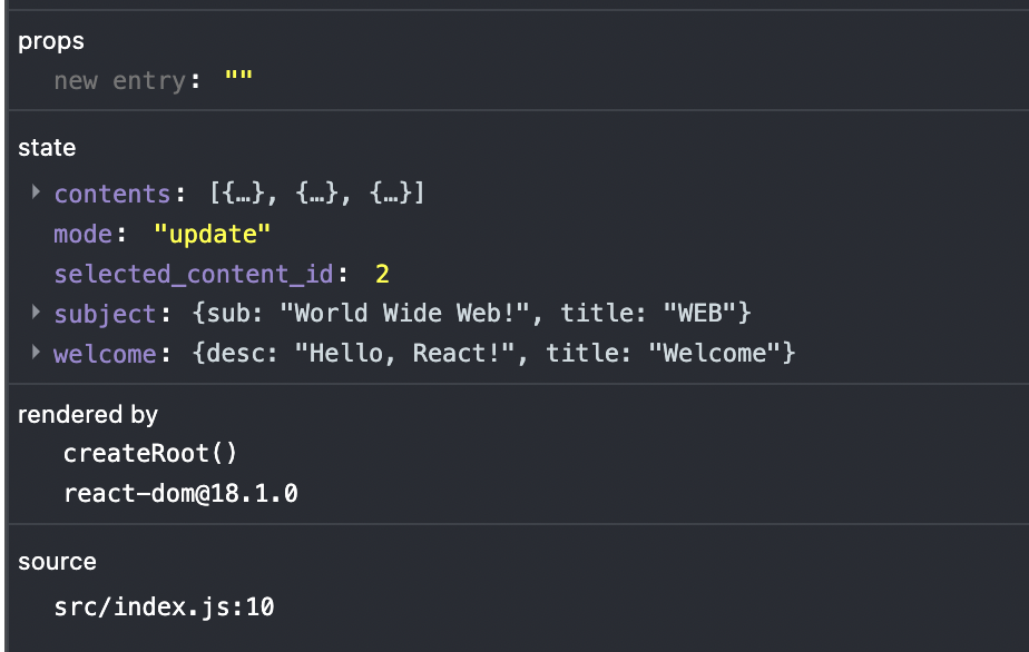 CreateContent 컴포넌트에서 onSubmit 함수를 구현하고 입력된 값을 받아온다. App.js 파일에서는 submit함수가 실행될 때마다 contents에 push함수를 사용해서 새로운 값을 추가하도록 작성하는데 현재 contents의 갯수를 참조할 수 있도록 max_content_id 변수를 추가하고 이 값을 이용해서 각 contents의 id를 저장한다.